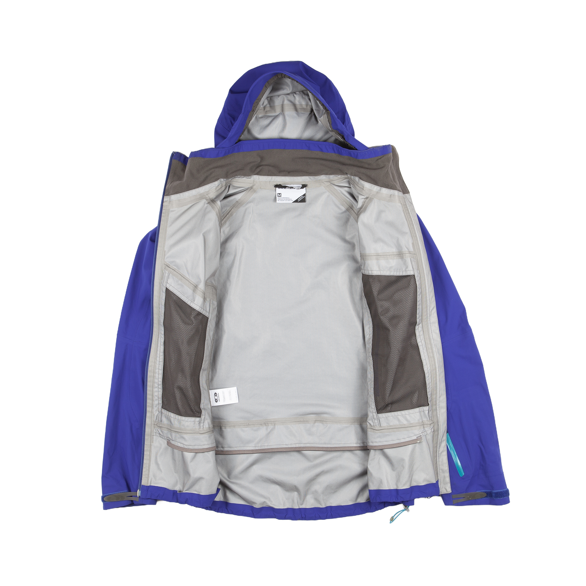 2010's Salomon waterproof shell jacket with seal taped zippers and asymmetrical front zipper. Adjustable hood, hem and arms. Two large access pockets in front and one small pocket in the left arm.
